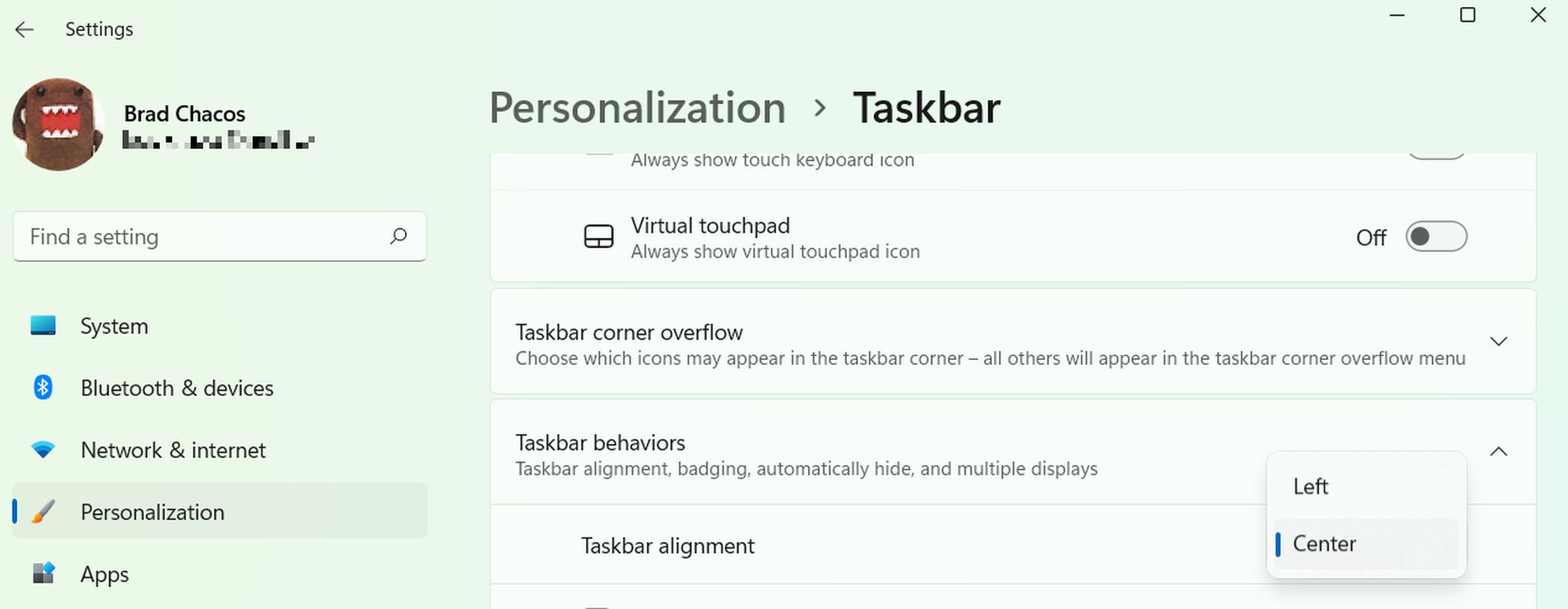 К счастью, Microsoft позволяет легко переместить меню «Пуск» обратно в левый угол. Просто откройте меню «Пуск» и перейдите к Настройки > Персонализация > Панель задач > Поведение панели задач. Вы увидите поле с надписью Выравнивание панели задач с выпадающим меню. Измените раскрывающееся меню с центра налево.
