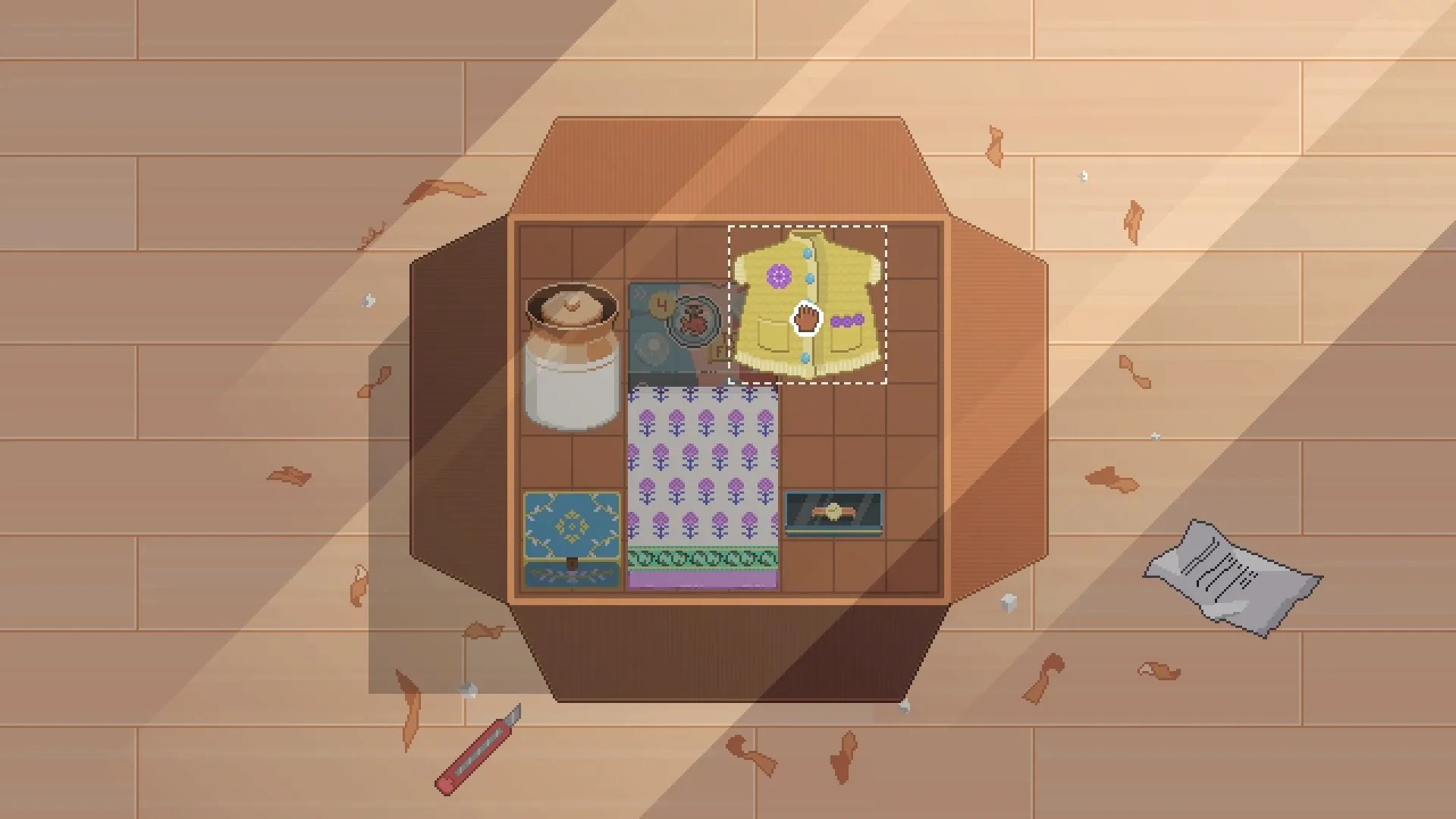 Действие игры происходит всего через месяц после того, как бабушка Ало, которую она ласково называла Джаджа, скончалась, и горе является постоянным призраком как в жизни Ало, так и в жизни ее матери. Когда Ало узнает, что ее мать хочет выбросить старые вещи Джаджи, чтобы добиться завершения, она вместо этого добровольно соглашается пройти через все это. Эти коробки занимают большие части квартиры Ало, каждая из которых является маленькой капсулой времени в ее совместное с бабушкой прошлое. Аквариум может напомнить некоторым игрокам Распаковка в этой механике, хотя перебирать каждую коробку — это небольшая головоломка, а не расставлять вещи по полкам.