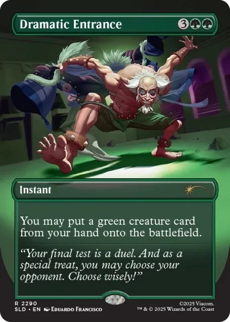 Затем Dramatic Entrance вновь появился как часть Аватар: Последний маг воздуха Secret Lair Superdrop, особенно выпуск «Все изменилось», выпущен в ноябре 2025 года. «Некоторая сила вспыхивает ярко и исчезает», — говорится в описании Капли. «Некоторые прячутся на виду. А некоторые угрожают полностью поглотить мир». На других карточках в Drop изображены знаковые битвы и моменты из шоу, но момент Буми, возможно, лучший: «Даже Буми, недооцененный за смехом и короной, показал силу, приближения которой никто не ожидал».