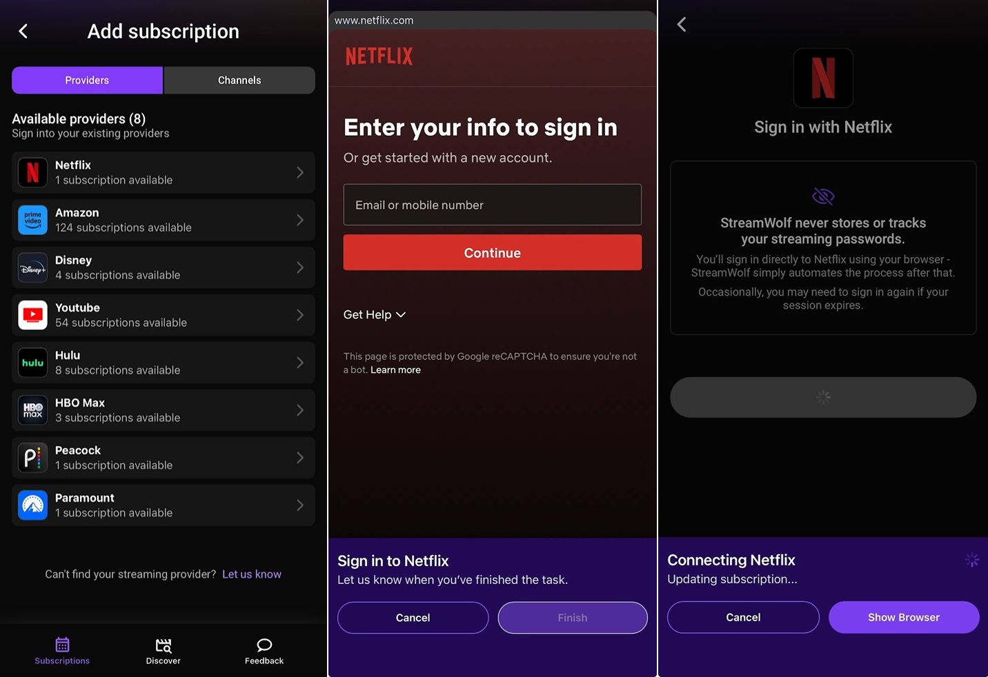 Напротив, StreamWolf полностью ориентирован на потоковую передачу, отслеживает ваши расходы без сбора конфиденциальных финансовых данных и автоматизирует утомительное управление вашими подписками. Это удовлетворяет очевидную потребность, поскольку стоимость слишком большого количества потоковых сервисов приближается к типичному счету за кабельное телевидение.